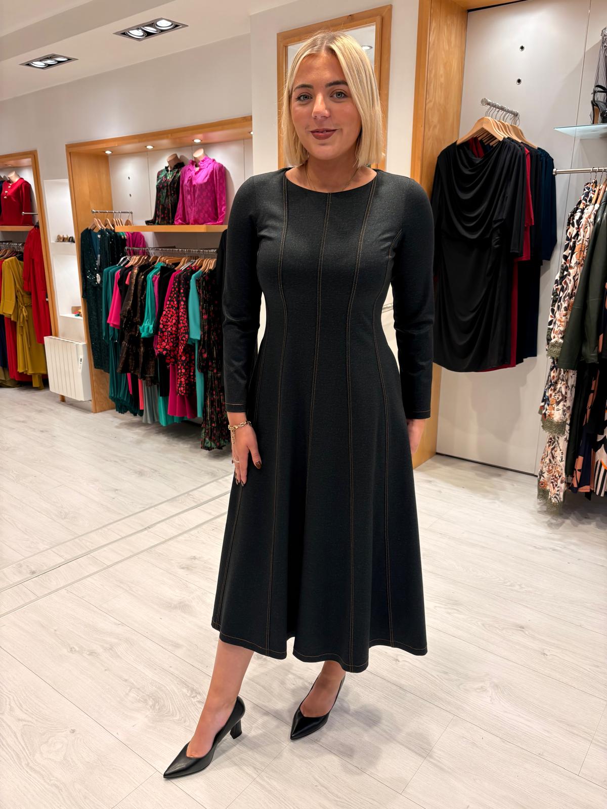 Effortlessly chic and timeless, this navy denim-look midi dress by Arggido combines refined tailoring with a modern edge. Crafted from a structured yet comfortable fabric with a soft denim-inspired texture, it features contrasting topstitch details that create a flattering, elongating effect.The fit-and-flare silhouette highlights the waist and flows beautifully through the skirt, while the round neckline, long sleeves, and concealed back zip ensure a sleek and polished finish. Perfect for both daytime elegance and smart evening occasions.Our model is 5'7ft and wears size Uk 10/ 40.
