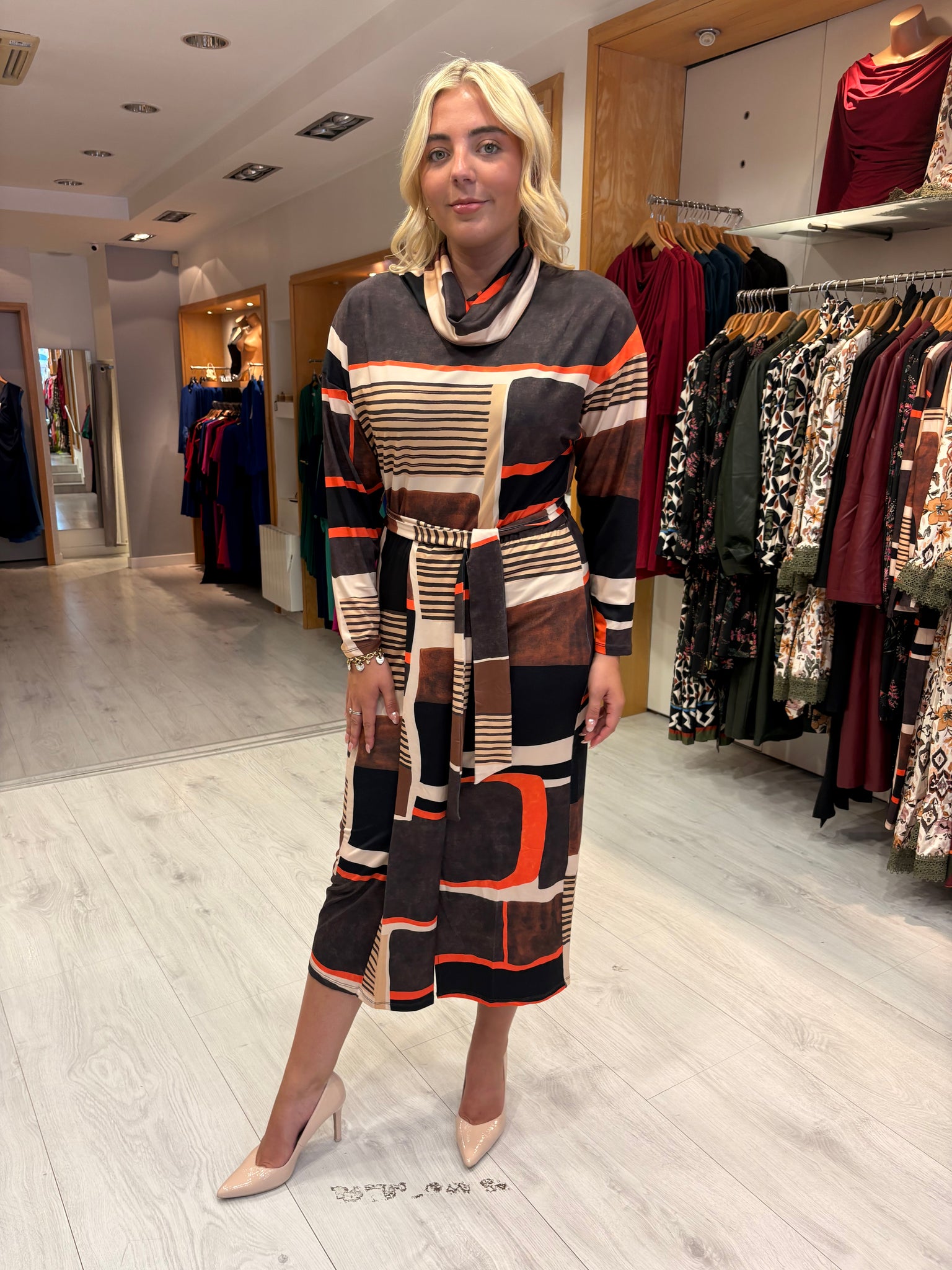 Sophisticated and stylish, this midi dress is designed with a bold geometric print in earthy tones with pops of orange for a modern edge. Featuring a soft cowl neckline and long sleeves, it offers both comfort and elegance. The detachable belt cinches the waist for a flattering silhouette, while the midi length keeps it versatile for work, evenings out, or special occasions. Pair with heels for a polished look or boots for a chic daytime style. Our Model is 5ft 7" tall and she is wearing the size UK 10 / S.