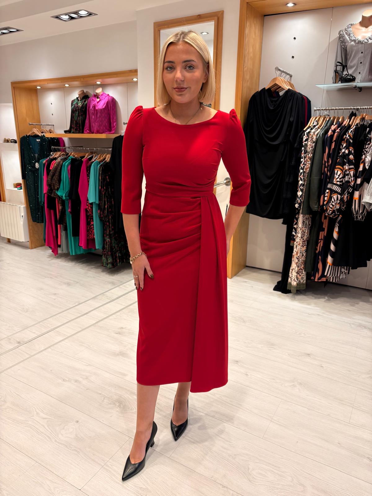 Step into timeless elegance with this striking red dress, designed to make a bold statement. Featuring a round neckline and graceful 3/4 sleeves, it offers a refined silhouette that’s both chic and versatile. The draped detailing along the waist and skirt adds a touch of sophistication, enhancing the figure with soft movement and flattering structure.Ideal for evening events, weddings, or festive celebrations, this vibrant dress pairs beautifully with metallic or nude accessories for a polished finish. Our model is 5ft 7" tall and she is wearing the size UK 10 / 40.