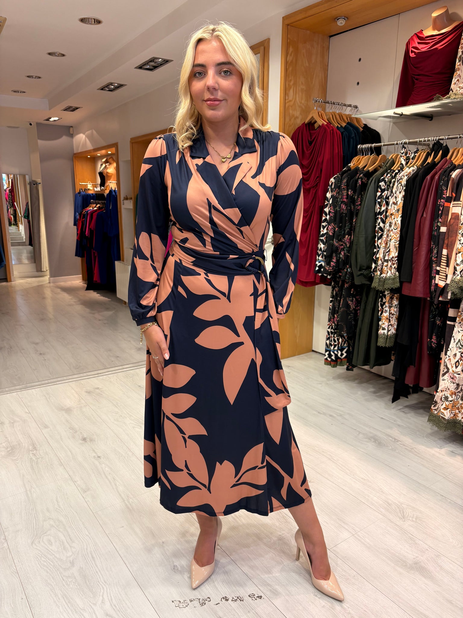 Effortlessly elegant, this wrap-style dress features a bold oversized leaf print in warm peach against a deep navy background. The wrap bodice flatters the figure, while the tie waist enhances your shape and ensures a comfortable fit. With long sleeves and a flowing midi-length skirt, this piece is perfect for both daytime sophistication and evening style. Pair with heels for a polished finish or boots for a modern twist. Our Model is 5ft 7" tall and she is wearing the size UK 10 / S.